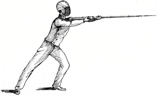 We now turn to the question of position. In quarter-staff[Pg 10] play it is usual for a right-handed man to stand with his left foot in advance of the right, as in boxing or bayonet exercise, and with his toe pointing straight in the direction of his adversary, as in Fig. 2. It is, however, often very advisable to advance the right foot suddenly to the front when bringing the butt of the staff to play on the left side of the enemy’s head or body. As regards “points” it is well to lunge out, as one does when making a left-handed lead-off in boxing, so as to gain somewhat in the reach.