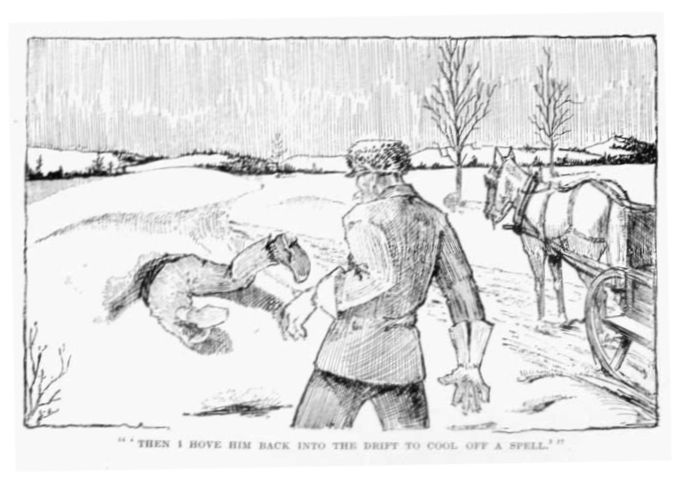 Calvin looked. In an old-fashioned high-backed sleigh, drawn by an ancient white horse, sat a little old man so wrapped in furs that only the tip of a frosty nose could be seen. He was waving whip and reins wildly, and shouting "Somebody come! somebody come!"