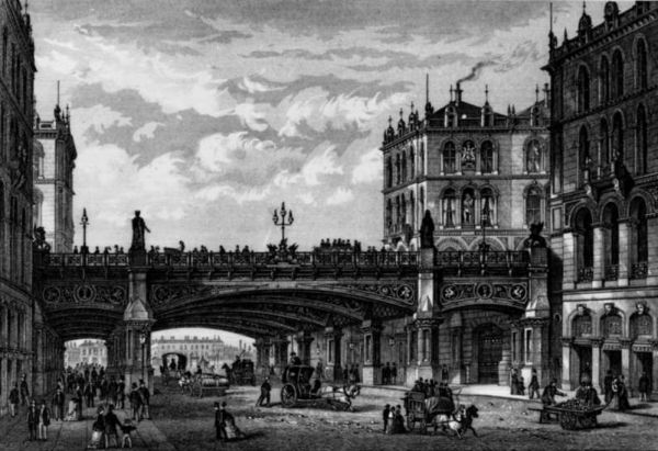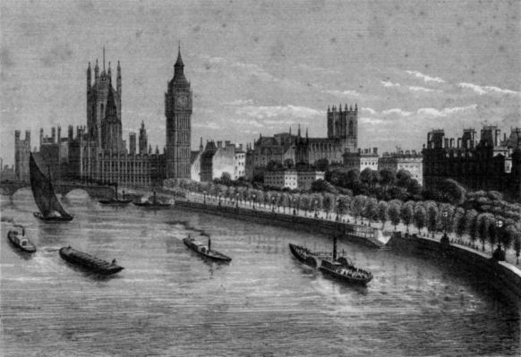 "The moon has now increased in power, and, acting on the mist, brings out the surrounding churches one by one. There they stand in the soft light, a noble army of temples thickly sprinkled amongst the money-changers. Any taste may be suited in structural design. There are high churches, low churches; flat churches; broad churches, narrow churches; square, round, and pointed churches; churches with towers like[Pg 1170] cubical slabs sunk deeply in between the roofs of houses; towers like toothpicks, like three-pronged forks, like pepper-casters, like factory chimneys, like limekilns, like a sailor's trousers hung up to dry, like bottles of fish-sauce, and like St. Paul's—a balloon turned topsy-turvy. There they stand, like giant spectral watchmen guarding the silent city, whose beating heart still murmurs in its sleep. At the hour of midnight they proclaim, with iron tongue, the advent of a New Year, mingling a song of joy with a wail for the departed....