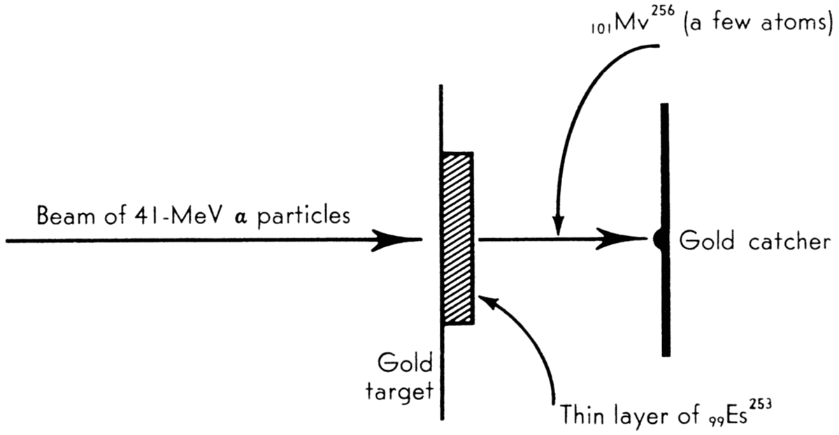 Researchers at the University of California used new techniques in forming and identifying element 101, mendelevium. A very thin layer of 99Es253 was electroplated onto a thin gold foil and was then bombarded, from behind the layer, with 41-MeV α particles. Unchanged 99Es253 stayed on the gold, but those atoms hit by α particles were knocked off and deposited on a "catcher" gold foil, which was then dissolved and analyzed (Fig. 3). This freed the new element from most of the very reactive parent substances, so that analysis was easier. Even so, the radioactivity was so weak that the new element was identified "one atom at a time"; this is possible because its daughter element, fermium, spontaneously fissions and releases energy in greater bursts than any possible contaminant.