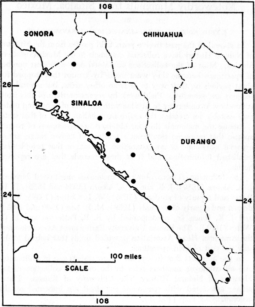 In several of the past twelve years field parties from the Museum of Natural History have collected mammals in the Mexican state of Sinaloa. Most of the collections contained only a modest number of specimens because they were made by groups that stopped for short periods on their way to or from other areas, but several collections are extensive. Field work by representatives of this institution now is underway in Sinaloa with the aim of acquiring materials suitable for treating the entire mammalian fauna of that state.