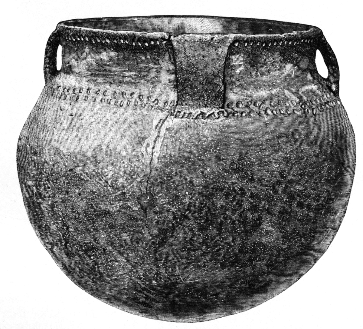 The specimen given in Fig. 415 has been considerably mutilated, but evidently belongs to the same class as the preceding. It probably also resembled the vessel which follows; it serves at least as a link between the two. The body is ornamented with carelessly drawn, deeply incised, involute designs.