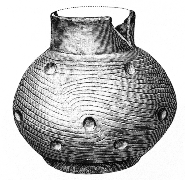 A very usual form is illustrated in Fig. 437. Below the overhanging lip the neck contracts and then expands until quite full, and at the base contracts again. This feature corresponds to the upper vessel suggested in the preceding case. Four flattened handles are placed about the upper part of the neck and three rows of small conical pits encircle the most expanded portion. The body is plain and much compressed [page 418] vertically. A low wide stand is attached to the base. A number of good examples, now in the National Museum, were found in Arkansas.
