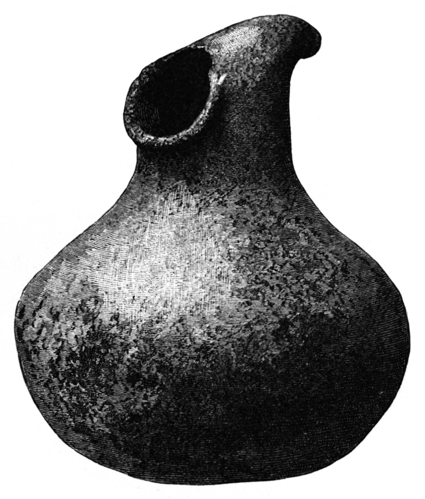 The vessel illustrated in Fig. 443 is of ordinary, dark, polished ware, and is entirely plain. It is peculiar in the shape of its extremities. The neck resembles a long truncated cone, and the legs are heavy and conical, being not unlike those of a common iron pot.