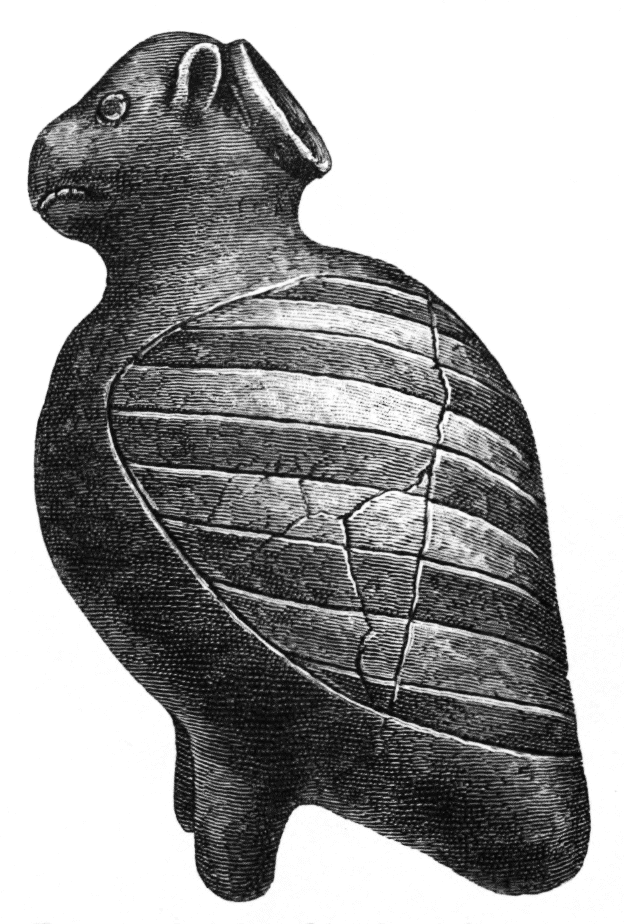 The owl was a favorite subject with the potter, probably on account of the upright, compact figure of the body, or possibly because of some especial regard in which this bird was held.