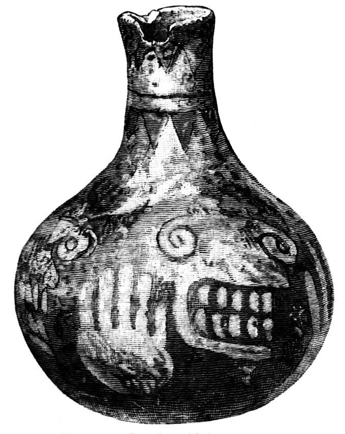 Quite distinct in outline from the preceding forms is the bottle shown in Fig. 432. The neck is high and cylindrical and the body resembles a slightly-flattened globe. Set about the shoulder are four medallion-like faces, the features of which are modeled roughly in low relief. The ware is of the ordinary dark, slightly polished variety.