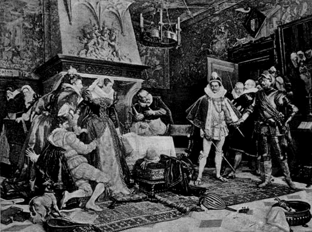 Ancrum Moor was fought in 1544. James V. had died two years earlier, and the crown of Scotland had devolved upon his infant daughter, Mary. Henry VIII. was bent on securing the Scotch kingdom, and to that end persisted in urging the betrothal of Prince Edward to the infant Mary, Queen of Scots; but the Scots were equally averse to the alliance, hence Henry continued to harass the kingdom by armed forces. After Edward VI. succeeded his father, he continued to sue for Mary's hand, and made use of military force in the hope of accomplishing his object. The child-queen's safety being in constant jeopardy, she was betrothed to the Dauphin of France, and in 1548 left for the court of France. In her sixteenth year she married Francis, making at the same time a secret treaty bestowing the kingdom of Scotland on France, in case she died without an heir. Francis II., however, died in 1560, and Mary returned to Scotland the following year. Here, her Roman Catholic practices soon brought her into conflict with Knox, but for a time she managed to rule without serious troubles. Romantic adventure, however, best [pg 409] describes the life of this lovely queen. She was beset with suitors and pestered with intrigue for her favor. The most popularly known story in connection with her life is that of her relation to Rizzio, her Italian confidant. He it was who arranged Mary's marriage to Darnley, and it was his influence over her that finally led to his own assassination by Darnley and his companions in Holyrood Palace in 1566. Shortly thereafter the queen gave birth to Prince James; and from this time troubles and conspiracies constantly involved the unhappy queen, until her execution in 1586 for her association in the Babington conspiracy against the life of Queen Elizabeth.