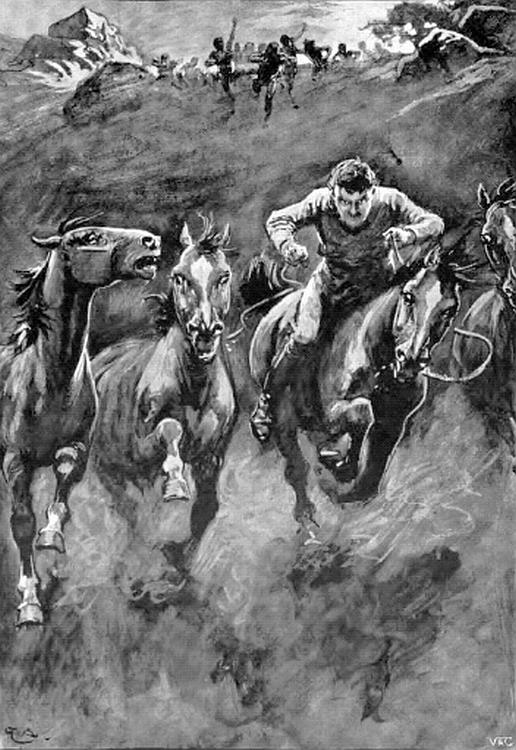 Then just what I had expected came to pass. Suddenly, and by a rapid, serpentine movement, the chief flung himself down, wriggling for the shade of a thick clump of bush we were passing, and simultaneously dark, sinuous forms started up in front, around us, seeming to spring from nowhere. Beryl’s pistol cracked, and then I saw a huge savage—naked, ochre-stained—poising a heavy knobkerrie for a throw. He could not, at that short distance, miss his mark—and that mark, Beryl. And he was behind her, and—she did not see him. It was all done in a second. I drove the spurs home, standing up in the stirrups to catch or ward off the murderous club as, with a whizz, it left his hand. I felt a sharp, fiery dig in the side, in my ears a jarring, roaring crash. My sight was scorched as with the blaze of a million fires, and then—blankness—oblivion!