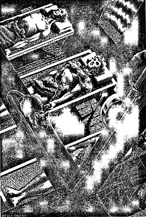 As before, some undeterminable interim of time had passed. And he knew he was alive. His body was stiff. He ached. There was a drumming in his head, and then a ringing in his ears as he tried to get up, managed to drag himself to an unsteady stance against the wall. He felt now an icy surety of horror that carried him out to a pin-point in space.