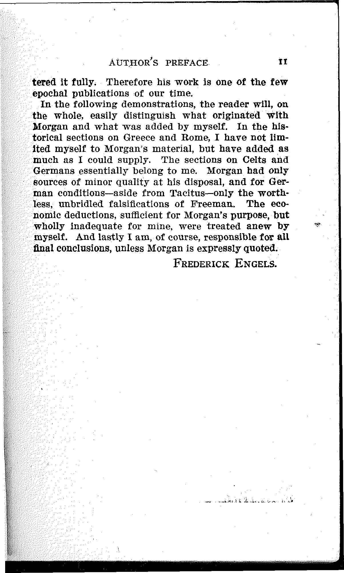 In the following demonstrations, the reader will, on the whole, easily distinguish what originated with Morgan and what was added by myself. In the historical sections on Greece and Rome, I have not limited myself to Morgan's material, but have added as much as I could supply. The sections on Celts and Germans essentially belong to me. Morgan had only sources of minor quality at his disposal, and for German conditions—aside from Tacitus—only the worthless, unbridled falsifications of Freeman. The economic deductions, sufficient for Morgan's purpose, but wholly inadequate for mine, were treated anew by myself. And lastly I am, of course, responsible for all final conclusions, unless Morgan is expressly quoted.