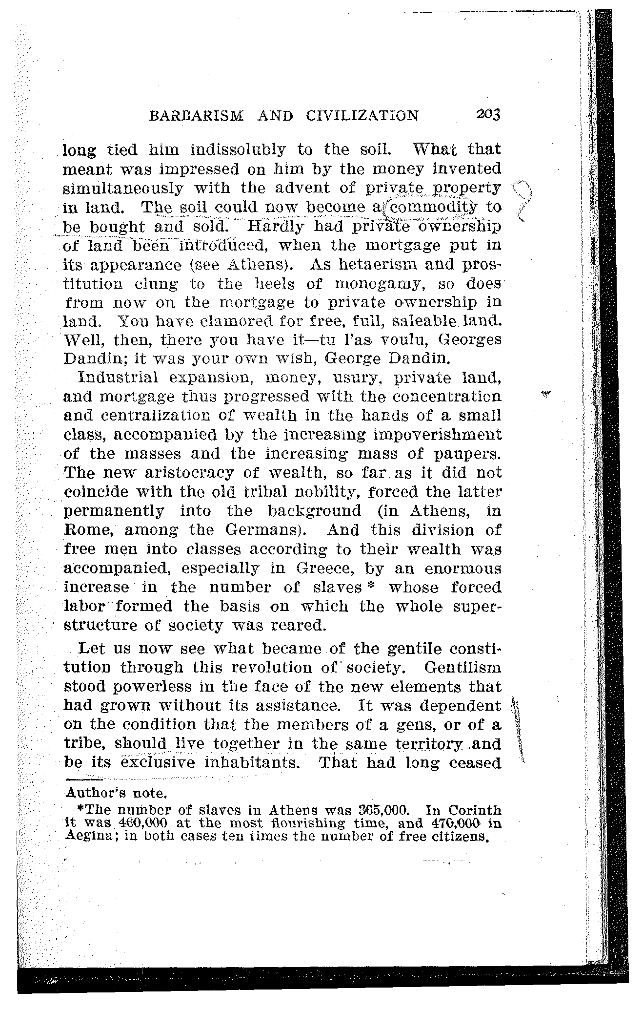 The wealth in commodities and slaves was now further increased by large holdings in land. The titles of the individuals to the lots of land formerly assigned to them by the gens or tribe had become so well established, that these lots were now owned and inherited. What the individuals had most desired of late was the liberation from the claim of the gentiles to their lots, a claim which had become a veritable fetter for them. They were rid of this fetter—but soon after they were also rid of their lots. The full, free ownership of the soil implied not only the possibility of uncurtailed possession, but also of selling the soil. As long as the soil belonged to the gens, this was impossible. But when the new land owner shook off the chains of the priority claim of the gens and tribe, he also tore the bond that had so[203] long tied him indissolubly to the soil. What that meant was impressed on him by the money invented simultaneously with the advent of private property in land. The soil could now become a commodity to be bought and sold. Hardly had private ownership of land been introduced, when the mortgage put in its appearance (see Athens). As hetaerism and prostitution clung to the heels of monogamy, so does from now on the mortgage to private ownership in land. You have clamored for free, full, saleable land. Well, then, there you have it—tu l'as voulu, Georges Dandin; it was your own wish, George Dandin.