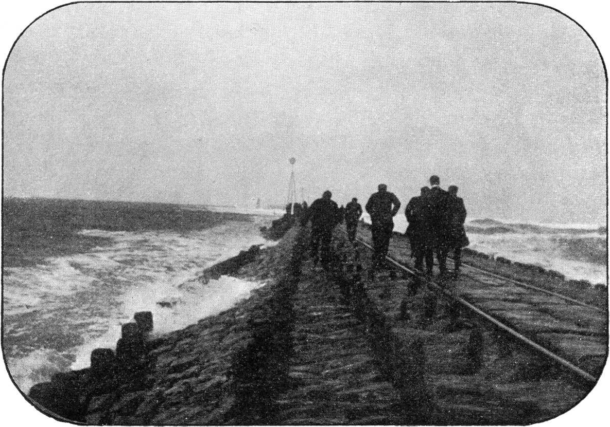 Drie, vier voet hoog stond het water op den dam, gierend joeg de storm en bulderend sloeg de zee erover heen, toen mannen als Klaas Ree, en Schoonbeek en Sperling het hoofd betraden. Elk paaltje, glad van zeewier, moest hoûvast wezen, tegen elke glibberige basaltkei moesten ze zich schrap zetten; in hun oliegoed, zwaar van water moesten ze als gymnasten balanceeren en hard loopen om op de been te blijven. En ze deden het, wat zeg ik, ze deden het met een vrouw op hun rug, met een zwakken, in doodsangst zich aan hen vastklemmenden schipbreukeling onder den arm, ze deden het terwijl om hen heen de zee in branding brulde als in woede over 't ontsnappen van den prooi. De brave, forsche, handige kerels! De helden der zee in vredestijd!