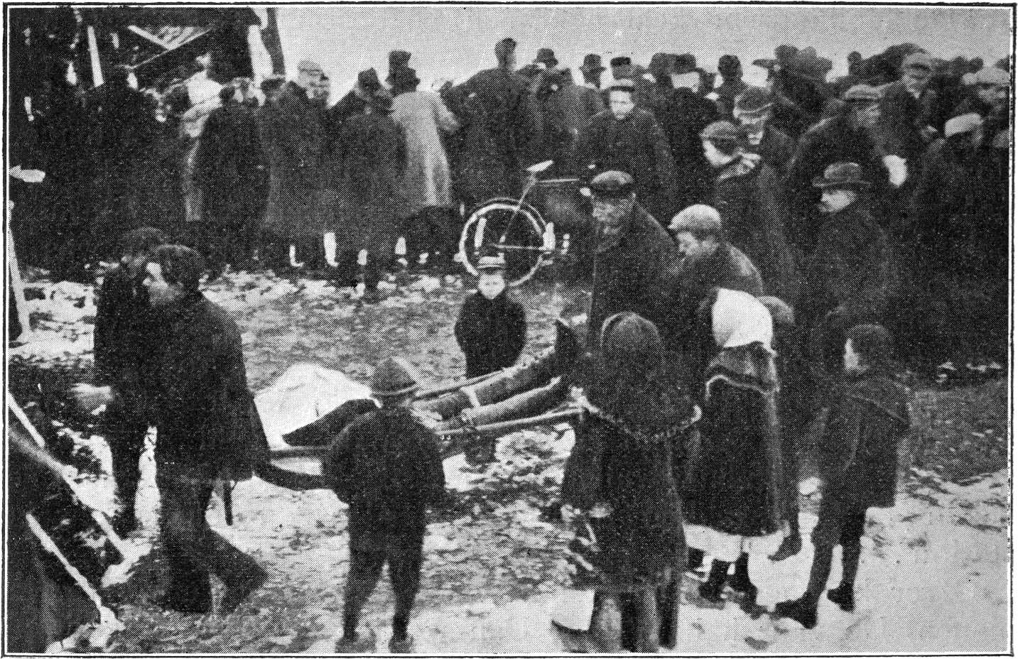 »Onder de verongelukten zijn er verscheidenen met zware kwetsuren. O. a. was er het lijk eener dame, waarvan een arm was afgescheurd.