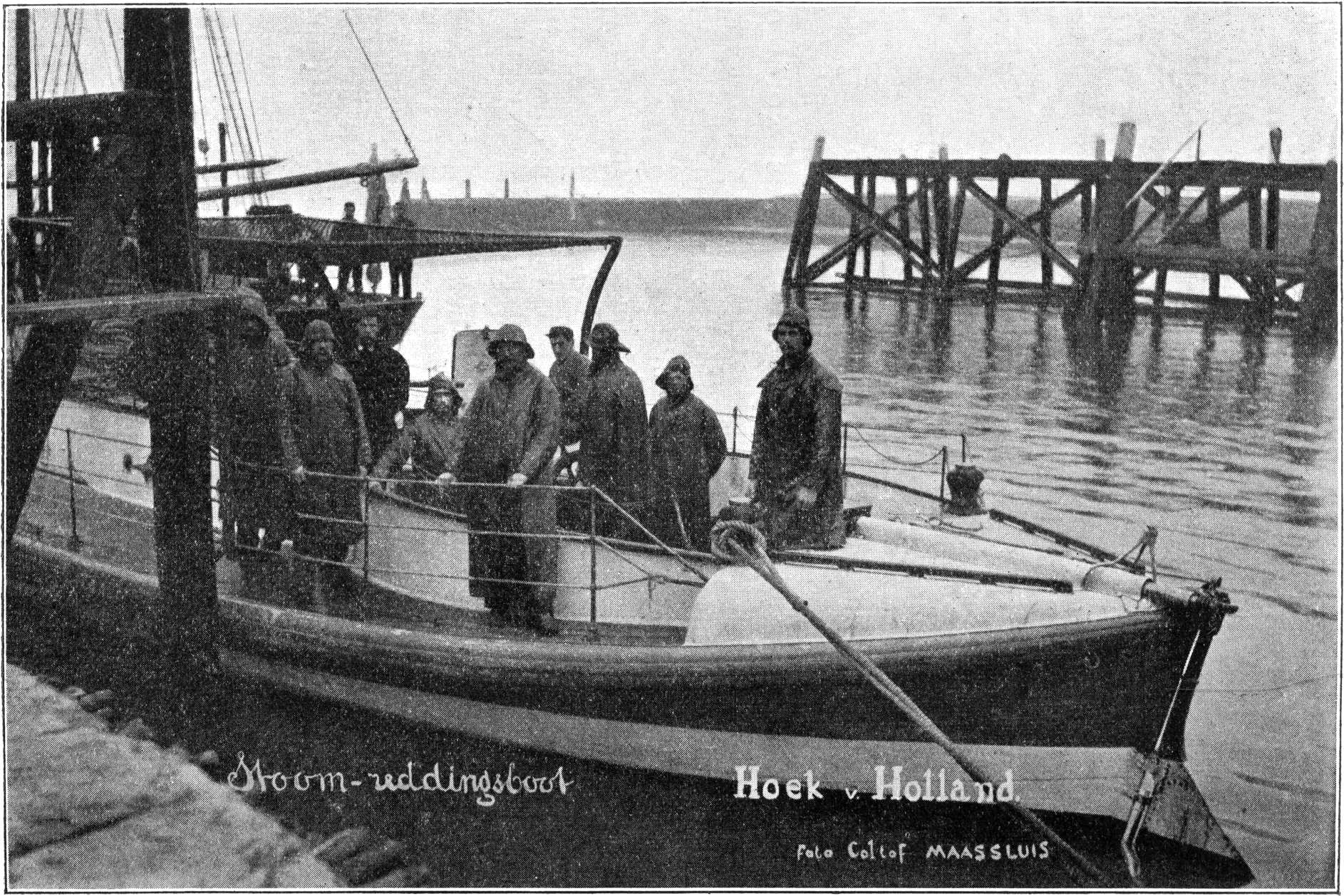 Goddank, op onze Hollandsche kusten, zoo gevaarlijk met haar zandbanken, met haar breede stranden, die weer den bouw van basaltdammen als kunstmatige rotsen noodig maakten, Goddank op die kusten zijn ook gekweekt die kloeke, welberaden, moedige mannen, de Redders. Op hen blijft ons vertrouwen!