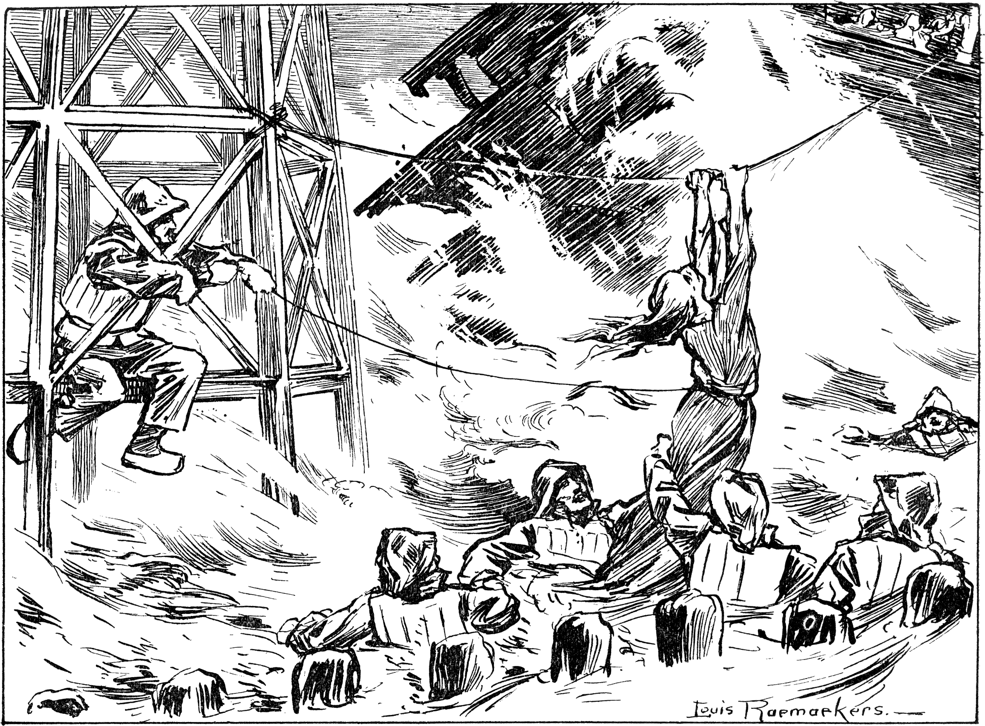 Een ander dacht een zweefbaan over de pier uit. De ondoelmatigheid van dat middel springt dadelijk in het oog voor allen, die weten dat bij deze redding de moeilijkheid niet was, de schipbreukelingen van het eind der pier naar den wal te krijgen, maar wel om hen van het wrak op het hoofd te brengen. Had er een zweefbaan bestaan, hun marteling zoude nog heviger geweest zijn. Dan toch hadden zij hun verbinding met den wal voortdurend kunnen zien, zonder er gebruik van te kunnen maken.