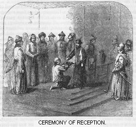 Near the town of Bathang, the soldiers of the garrison were drawn up in line, to do military honours to the Pacificator of p. 293Kingdoms, who, perched up, at the bottom of his palanquin, went through the ranks in a very unwarlike manner. The Thibetian population, who were all on foot, accompanied the caravan to a beautiful Chinese pagoda which was to serve for our lodging. The same evening, the Mandarins of the Chinese garrison and the Grand Lamas of the town, came to pay us a visit, and to offer us some beef and mutton, butter, corn, candles, bacon, rice, nuts, raisins, apricots, and other products of the country.