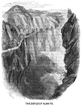 Four days after our departure from Kiang-Tsa, we reached the banks of the Kin-Cha-Kiang (River of Gold-dust), which we had already crossed on the ice with the Thibetian ambassador, two months before our arrival at Lha-Ssa. Amid the beautiful plains of China, this magnificent river rolls on its blue waves with an imposing majesty; but among the mountains of Thibet, it is ever bounding about, throwing the great mass of its waters to the bottom of gorges and valleys, with terrible impetuosity and noise. At the spot where we came to the river, it was enclosed between two mountains, the sharp flanks of which, rising perpendicularly on its banks, made for it a narrow but extremely deep bed; the waters ran rapidly, sending forth a low and lugubrious sound. From time to time, we saw huge masses of ice approach, which, after having whirled round in a thousand eddies, at last were dashed to pieces against the sharp projections of the mountain.