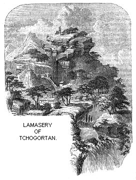 At eleven leagues from Tang-Keou-Eul there is, in the land of the Si-Fan, or Eastern Thibetians, a Lamasery, whose fame extends not merely throughout Tartary, but even to the remotest parts of Thibet. Thither pilgrims flock from all quarters, venerating; for there was born Tsong-Kaba-Remboutchi, the famous reformer of Buddhism. The Lamasery bears the name of Kounboum, and its Lama population numbers no fewer than 4,000 persons, Si-Fan, Tartars, Thibetians, and Dchiahours. It was determined that one of us should visit this place, and endeavour to engage a Lama to come and teach us for a few months the Thibetian language. M. Gabet, accordingly, departed on this mission, accompanied by Samdadchiemba, while M. Huc remained at Tang-Keou-Eul, to take care of the animals and of the baggage.