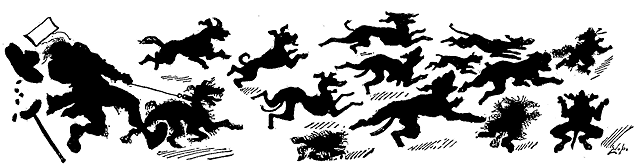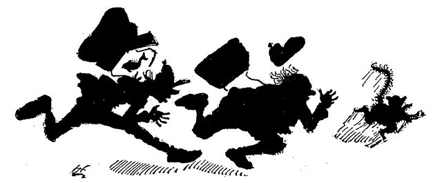 XXXIV Pensez si nos pauvres gens Firent piteuse figure. Retrouvant de leurs quinze ans L'ardeur et la vive allure, Ils poursuivent, furieux, L'animal malencontreux, Qui, plus qu'eux rapide et leste, Part sans demander son reste. |