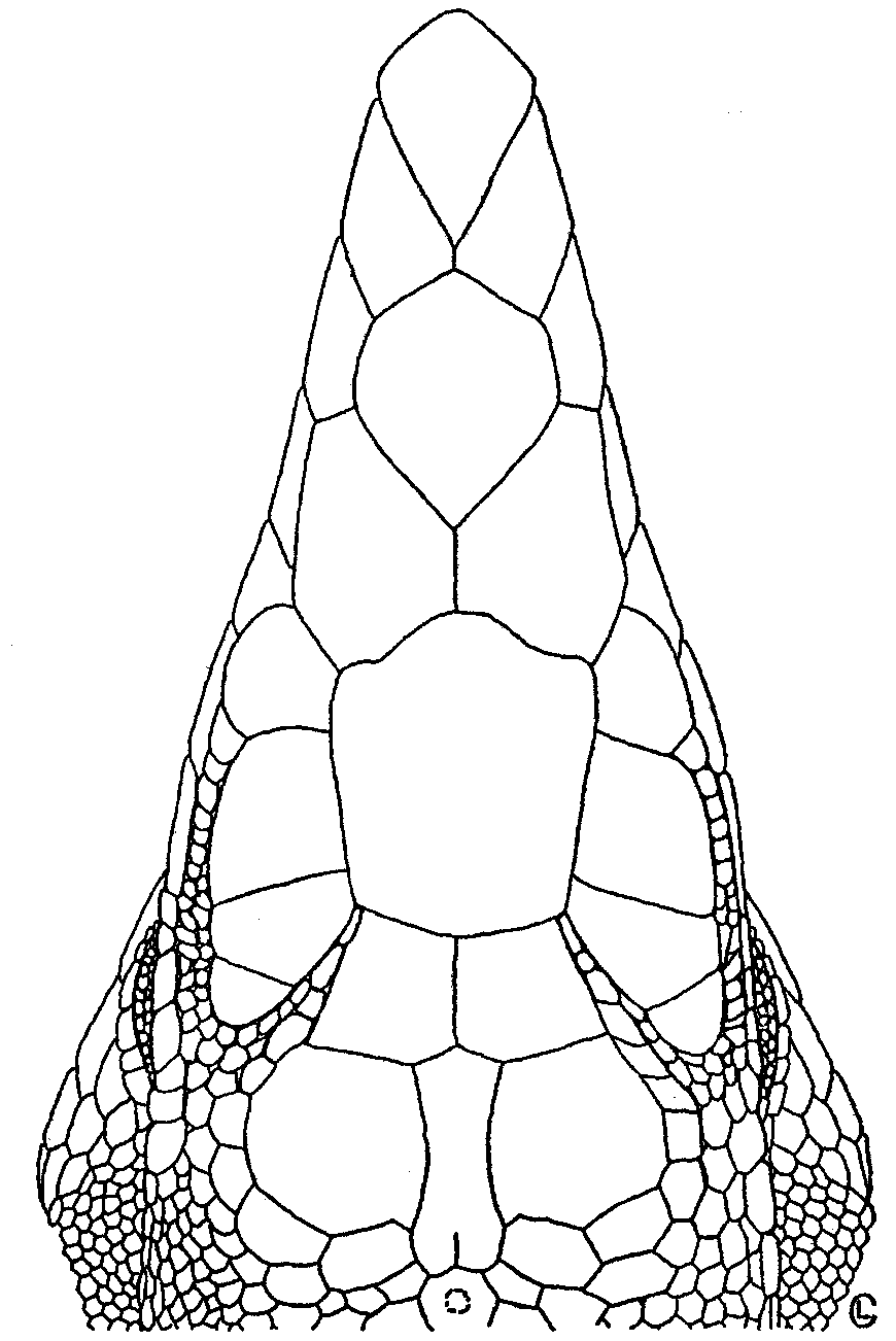 Description of Holotype.—Snout-vent length, 128 mm.; tail length, 252 mm.; tail/body ratio, 1.97; scutellation typical of sacki—four supraoculars, enlarged postantebrachials, and enlarged mesoptychials; 107 granules around midbody (excluding enlarged ventrals); 45 femoral pores; three enlarged preanal scales; supraorbital semicircle-series extending anteriorly to posterior edge of frontal (Fig. 1).