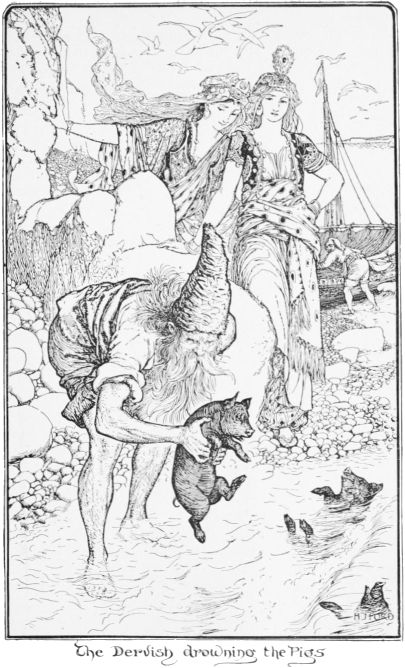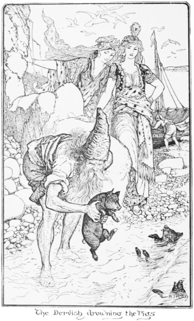 Richard began to regret his thyme and blackberries, and the eldest brother seized the pony by the mane and tried to make it turn round, for he remembered the blue eyes of Jacob the rope-maker's daughter. But he tugged and pulled in vain, for the pony galloped straight on into the sea, till the waves met its forefeet. As soon as it felt the water it neighed lustily and capered about with glee, advancing quickly into the foaming billows. When the waves had covered the children's legs they repented their careless behaviour, and cried out: 'The cursed little black pony is bewitched. If we had only listened to old Peggy's advice we shouldn't have been lost.'
