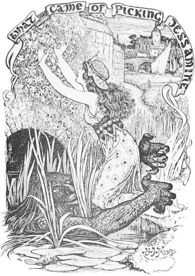 One day she was sitting on the banks of a stream bewailing her wretched lot, when she suddenly caught sight of herself in the water. Her hair and part of her face was quite concealed by the ass's head, which was drawn right over like a hood, and the filthy matted skin covered her whole body. It was the first time she had seen herself as other people saw her, and she was filled with shame at the spectacle. Then she threw off her disguise and jumped into the water, plunging in again and again, till she shone like ivory. When it was time to go back to the farm, she was forced to put on the skin which disguised her, and now seemed more dirty than ever; but, as she did so, she comforted herself with the thought that to-morrow was a holiday, and that she would be able for a few hours to forget that she was a farm girl, and be a princess once more.