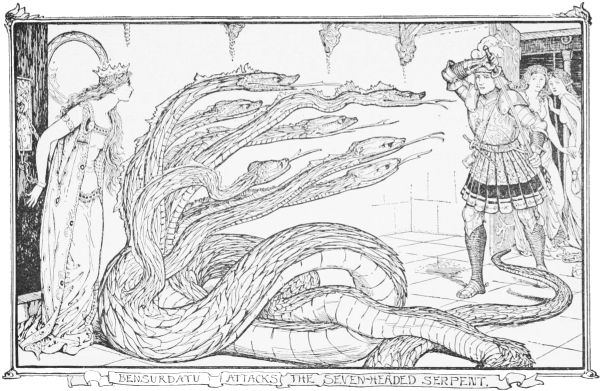 When they had done their supper they looked about for some place to sleep. But suddenly the door burst open, and the wizard entered the hall. He was old and hump-backed, with a bald head and a grey beard that fell to his knees. He wore a black robe, and instead of a belt three iron circlets clasped his waist. He led by the hand a lady of wonderful beauty, dressed in white, with a girdle of silver and a crown of pearls, but her face was pale and sad as death itself.