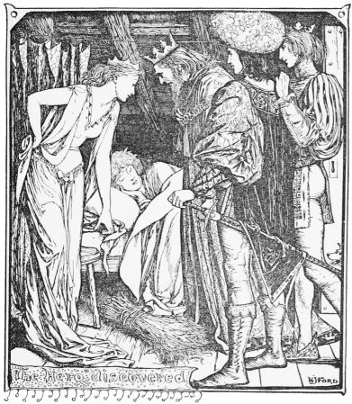 The king and queen examined the tiny ring very closely, and agreed, with their son, that the wearer could be no mere farm girl. Then the king went out and ordered heralds and trumpeters to go through the town, summoning every maiden to the palace. And she whom the ring fitted would some day be queen.