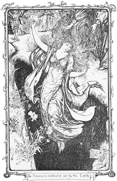 The prince obeyed, and was enchanted to see the princess appear at his side. But when the sun peeped for the first time over the mountains, the door burst open as before, and the wizard entered with a loud laugh. Suddenly he caught sight of the princess; his face darkened, he uttered a low growl, and one of the iron circlets gave way with a crash. He seized the young girl by the hand and bore her away with him.