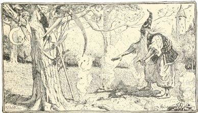 Once upon a time three musicians left their home and set out on their travels. They had all learnt music from the same master, and they determined to stick together and to seek their fortune in foreign lands. They wandered merrily from place to place and made quite a good living, and were much appreciated by everyone who heard them play. One evening they came to a village where they delighted all the company with their beautiful music. At last they ceased playing, and began to eat and drink and listen to the talk that was going on around them. They heard all the gossip of the place, and many wonderful things were related and discussed. At last the conversation fell on a castle in the neighbourhood, about which many strange and marvellous things were told. One person said that hidden treasure was to be found there; another that the richest food was always to be had there, although the castle was uninhabited; and a third, that an evil spirit dwelt within the walls, so terrible, that anyone who forced his way into the castle came out of it more dead than alive.