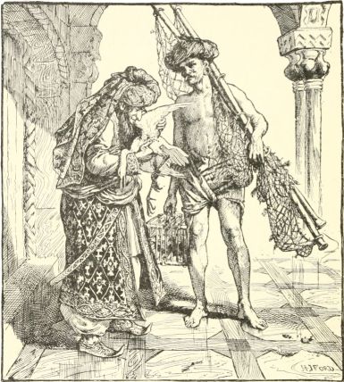So the fisherman went home, and when he came there he saw the whole castle was made of polished marble, ornamented with alabaster statues and gold. Before the gate soldiers were marching, blowing trumpets and beating drums. Inside the palace were walking barons, counts, and dukes, acting as servants; they opened the door, which was of beaten gold. And when he entered, he saw his wife upon a throne which was made out of a single block of gold, and which was quite six cubits high. She had on a great golden crown which was three yards high and set with brilliants and sparkling gems. In one hand she held a sceptre, and in the other the imperial globe, and on either side of her stood two rows of halberdiers, each smaller than the other, from a seven-foot giant to the tiniest little dwarf no higher than my little finger. Many princes and dukes were standing before her. The fisherman went up to her quietly and said:
