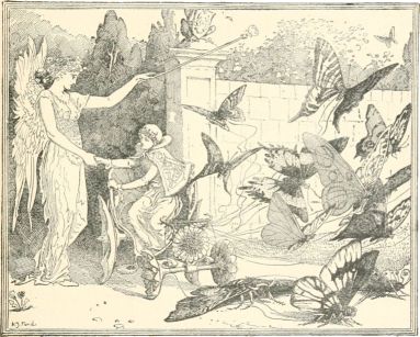 Then the old man found himself obliged to fulfil his promise, though he had had no intention of doing so, and had only desired to get his beard back. He made the youth follow him through dark secret passages, underground vaults, and grey rocks till at last they came to an open field, which looked as if it belonged to a more beautiful world than ours. Then they came to a stream of rushing water; but the little man drew out a wand and touched the waves, whereupon the waters parted and stood still, and the two crossed the river with dry feet. And how beautiful everything on the other side was! lovely green paths leading through woods and fields covered with flowers, birds with gold and silver feathers singing on the trees, lovely butterflies and glittering beetles fluttered and crawled about, and dear little beasts hid in the bushes and hedges. The sky above them was not blue, but like rays of pure gold, and the stars looked twice their usual size, and far more brilliant than on our earth.