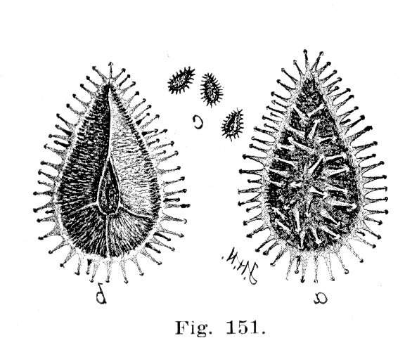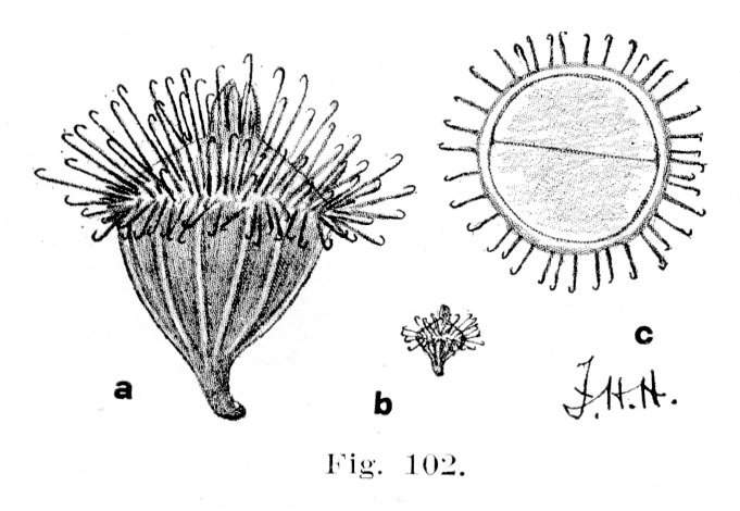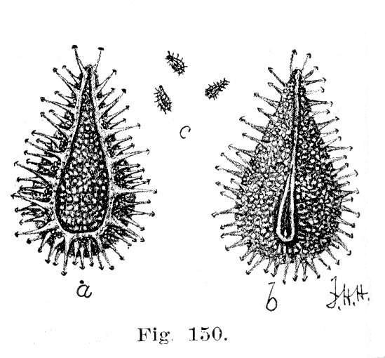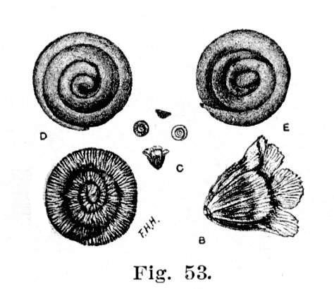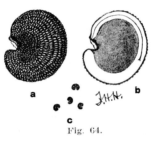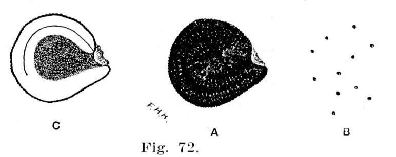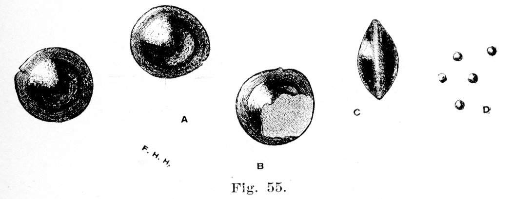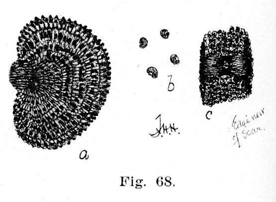 'nearly circular, each side covered with 5-6 curved rows of tubercles,