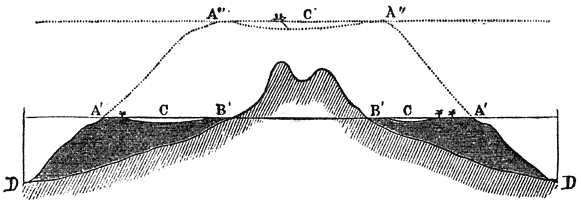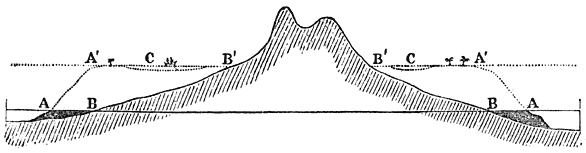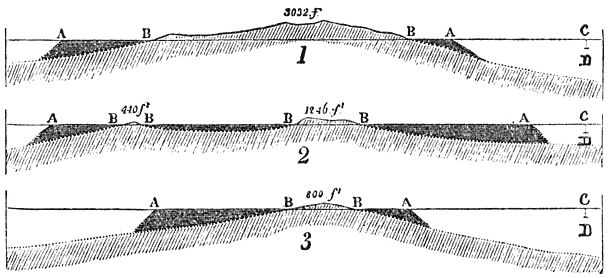 Over de geheele lengte der Braziliaansche kust—een afstand van minstens 2000 mijlen—en zeker over eene aanzienlijke breedte landwaarts in, behoort het voorkomende vaste gesteente tot eene graniet-formatie. De omstandigheid, dat deze reusachtige oppervlakte saâmgesteld is uit stoffen, welke de meeste geologen aannemen als in heeten staat onder hooge drukking gekristalliseerd te zijn, leidt tot vele interessante beschouwingen. Had dit proces plaats op den bodem van een diepen oceaan, of strekte zich aanvankelijk een lagendek daarover uit, dat later verwijderd is geworden? Mogen wij aannemen, dat eene kracht, die haast oneindig lang werkte, in staat was het graniet over zooveel duizenden vierkante leagues te ontblooten?