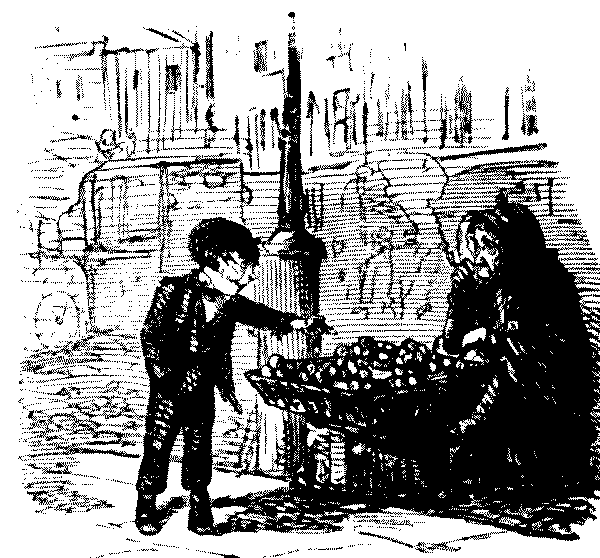 Sharp (but vulgar) little boy. "Hallo, missus, wot are those?" Old Woman. "Twopence." Boy. "What a lie! They're apples."