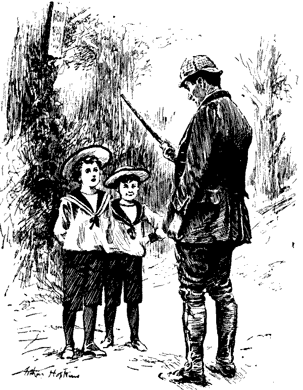 Well brought up.—"Now then, my little men, didn't you see that board on that tree?" "Yes." "Well, then, can't you read?" "Yes, but we never look at anything marked 'private.'"