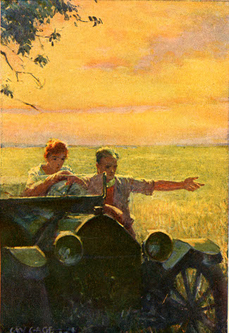Down in the oak-grove, Joe Thomson stood leaning against a low bough, staring out at the river valley, with the shimmering glow of the twilight sky above it. At the soft whirring sound of an automobile he turned, to see a gray runabout coasting down the long slope from the three cottonwoods.