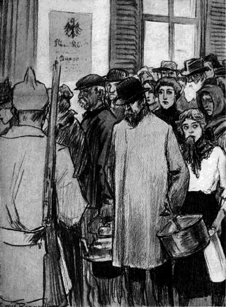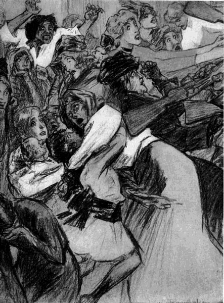 The campaign of publicity launched by the Times was taken up by the British and French press. The public flocked to view, and were stunned as they had never been before by the damning record. The cumulative effect of such pictures as “The Shields of Rosselaere,” showing men, women, and children forced to march in front of the German armies, “Men to the right, women to the left,” in which women and children are being beaten with the butts of rifles; “The Exodus from Antwerp,” “The Mothers of Belgium,” “The Widows of Belgium,” and others which revealed unimaginable depths of human agony, impressed the London crowd as by a solemn ritual. They saw with a vividness hitherto unapproached the hideousness of the war, the unequivocal brutality of the German method, and the naked, insatiable greed in the German purpose. Not now could the timidest soul believe that Germany was fighting a war of defense. Here was the fact inescapable that civilization itself was threatened; here was the whole carnival of lust and conquest as mercilessly depicted on the faces of its agents as they themselves had trampled onward to their shocking goal.