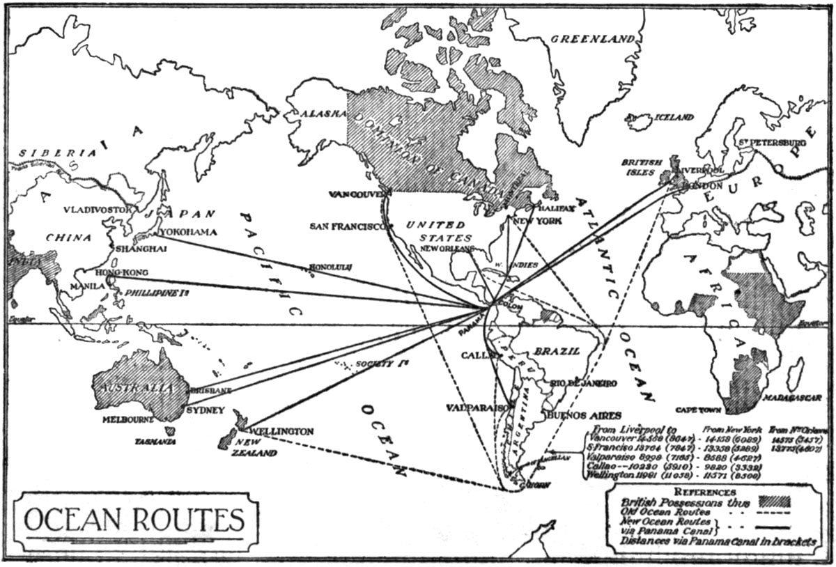The new canal rather diminishes the force of such similitudes. It is not simply that the east of Canada and the United States, as representing Western civilization, is brought much closer to China and Japan; that the passage from West to East which the early navigators vainly sought is now thrown open. The important thing is that the Pacific is going to be the scene of commercial and political rivalries in which the slowly awakening people of China and the already wide-awake people of Japan will take part. All the Pacific Ocean westward to 160 degrees of longitude east of Greenwich is brought nearer to England and the western coasts of Europe. The entire ocean right back to the western extremity of Australia is brought closer to the governmental and industrial centres of the United States and Canada.