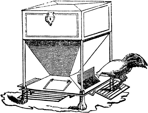 Their food is better when given to them warm, not hot, and there should always be a supply before them to prevent gorging. It is better to be placed on shelves or suspended boxes or hoppers, which are variously and cheaply constructed, to keep it clean and out of the reach of rats. Besides their food, hens ought to be at all times abundantly supplied with clean water, egg or pounded oyster shells, old mortar or slacked lime. If not allowed to run at large, where they can[Pg 218] help themselves, they must also be furnished with gravel to assist their digestion; and a box or bed of ashes, sand, and dust, is equally essential to roll in for the purpose of ridding themselves of vermin.