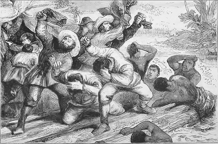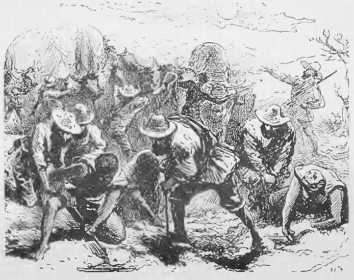 And mingling with these cries of distress, at intervals came the crack of a whip, loud as the report of a pistol, and the shouts of the drivers urging their oxen on.