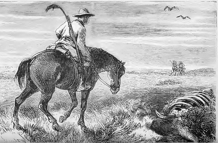 Retarded by these various obstructions, they made but slow progress; less than three miles an hour—the orthodox rate of speed made by South African travellers “on trek;” and it had come to be a struggle painful as it was perilous. Fearfully dispiriting too; since they knew not when or how it was to end. Their sole hope rested on a large pond or lake their guide told them of, and which he had never known to go dry. But it was still over ten miles distant, which meant at least four hours of time—an appalling prospect in their then condition; men, horses, and oxen, all athirst, all tottering in their steps. There was no help for it, no alternative, but keep on; and on they kept.