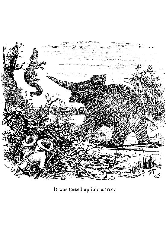 Only for a few seconds stood he thus, when his little eyes began to sparkle with a peculiar intelligence, his ears giving indication of the same by a satisfied flap or two, as much as to say, “Now I know what did it.” Then, as if determined to have his bath out, he strode back into the water, till nearly knee-deep, and once more plunged his proboscis underneath. But his design was all different, as the spectators were soon made aware by seeing a ripple on the surface of the water, a moving furrow as from the dorsal fin of a shark, but which they knew to be caused by a crocodile. And a crocodile it was; one of small size, not over six or seven feet in length. But surely the same that had made a snap at the elephant’s trunk, inflicting a wound which, though slight, was enough to account for that angry scream, with the action accompanying.