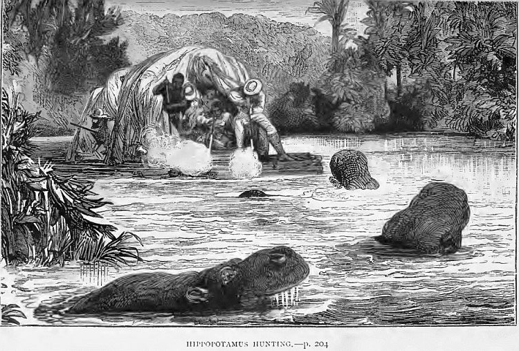 Many so fell, and doubtless more would have fallen; but before they had been long thus engaged, an order was issued for them to desist. It came from Jan Van Dorn, who had just conceived a grand economic scheme, suggested by something he saw in the river. This was a hippopotamus, or rather several; for since leaving the foot of the rapids, numbers of these amphibia had been observed, some waddling about upon the banks, others swimming to and fro in the water, the cows with calves on their backs; still others at rest on the surface as if asleep, with white birds—a species of sea-gull—perched upon their shoulders. Even those moving about had each its quota of such perchers, now and then affording an amusing spectacle, as the unwieldy quadrupeds sank under water, forcing the birds to take wing with an odd air of bewilderment. Not so different was the behaviour of the quadrupeds themselves, as they saw the raft bear down upon them, and go drifting by—a sight altogether new to them. They may have seen canoes, water-horses, and other contrivances of river navigation in use among the natives, but never a craft like that—never one of such monstrous dimensions. And a monster it must have appeared to them, as at intervals it belched forth flame and smoke, accompanied by the loud reports of the roers.