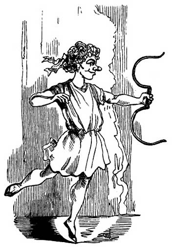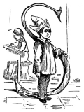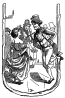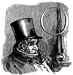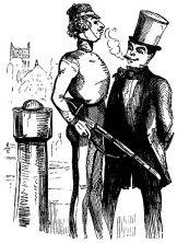 Jeames's attention had been gradually drawn from the moon in the [pg 388] heavens to this sublunary scene; and he was puzzled and alarmed by the appearance of the man in shiny boots. "A holtercation," he remarked afterward in the servants'-hall—a "holtercation with a feller in the streets is never no good; and indeed he was not hired for any such purpose." So, having surveyed the man for some time, who went on laughing, reeling, nodding his head with tipsy knowingness, Jeames looked out of the portico, and softly called "Pleaceman," and beckoned to that officer.