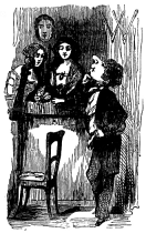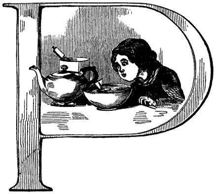 "I'll come up after dinner, fast enough," he said, simply. "I don't care about much wine afterward—I take my whack at dinner—I mean my share, you know; and when I have had as much as I want I toddle up to tea. I'm a domestic character, Miss Amory—my habits are simple—and when I'm pleased I'm generally in a good humor, ain't I, Pen?—that jelly, if you please—not that one, the other with the cherries inside. How the doose do they get those cherries inside the jellies?" In this way the artless youth prattled on; and Miss Amory listened to him with inexhaustible good humor. When the ladies took their departure for the upper regions, Blanche made the two young men promise faithfully to quit the table soon, and departed with kind glances to each. She dropped her gloves on Foker's side of the table, and her handkerchief on Pen's. Each had some little attention paid to him: her politeness to Mr. Foker was perhaps a little more encouraging than her kindness to Arthur; but the benevolent little creature did her best to make both the gentlemen happy. Foker caught her last glance as she rushed out of the door; that bright look passed over Mr. Strong's broad white waistcoat, and shot straight at Harry Foker's. The door closed on the charmer: he sate down with a sigh, and swallowed a bumper of claret.