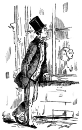 The man at the railings was very gorgeously attired with chains, jewelry, and waistcoats, which the illumination from the house lighted up to great advantage; his boots were shiny; he had brass buttons to his coat, and large white wristbands over his knuckles; and indeed looked so grand, that X imagined he beheld a member of parliament, or a person of consideration before him. Whatever his rank, however, the M.P., or person of consideration, was considerably excited by wine; for he lurched and reeled somewhat in his gait, and his hat was cocked over his wild and blood-shot eyes in a manner which no sober hat ever could assume. His copious black hair was evidently surreptitious, and his whiskers of the Tyrian purple.