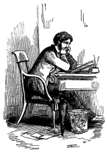 Then, according to her promise, Miss Amory made music for the young men. Foker was enraptured with her performance, and kindly joined in the airs which she sang, when he happened to be acquainted with them. Pen affected to talk aside with others of the party, but Blanche brought him quickly to the piano, by singing some of his own words, those which we have given in a previous number, indeed, and which the Sylphide had herself, she said, set to music. I don't know whether the air was hers, or how much of it was arranged for her by Signor Twankidillo, from whom she took lessons; but good or bad, original or otherwise, it delighted Mr. Pen, who remained by her side, and turned the leaves now for her most assiduously. "Gad! how I wish I could write verses like you, Pen," Foker sighed afterward to his companion. "If I could do 'em, wouldn't I, that's all? But I never was a dab at writing, you see, and I'm sorry I was so idle when I was at school."