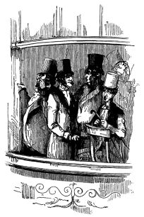 The windows of the dining-room were opened to let in the fresh air, and afforded to the passers-by in the street a pleasant, or, perhaps, tantalizing view of six gentlemen in white waistcoats, with a quantity of decanters and a variety of fruits before them—little boys, as they passed and jumped up at the area-railings, and took a peep, said to one another, "Mi hi, Jim, shouldn't you like to be there, and have a cut of that there pine-apple?"—the horses and carriages of the nobility and gentry passed by, conveying them to Belgravian toilets: the policeman, with clamping feet, patrolled up and down before the mansion: the shades of evening began to fall: the gas-man came and lighted the lamps before Sir Francis's door: the butler entered the dining-room, and illuminated the antique Gothic chandelier over the antique carved oak dining-table: so that from outside the house you looked inward upon a night scene of feasting and wax candles; and from within you beheld a vision of a calm summer evening, and the wall of St. James's Park, and the sky above, in which a star or two was just beginning to twinkle.
