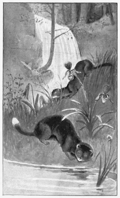 The Minks lived by a waterfall in the river, and had burrows in the banks, where the young Minks stayed until they were large enough to go out into the world. Then the fathers and mothers were very busy, for in each home there were four or five or six children, hungry and restless, and needing to be taught many things.